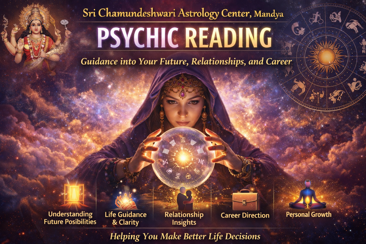 At Sri Chamundeshwari Astrology Center, we provide accurate psychic readings based on spiritual intuition and traditional astrology knowledge.