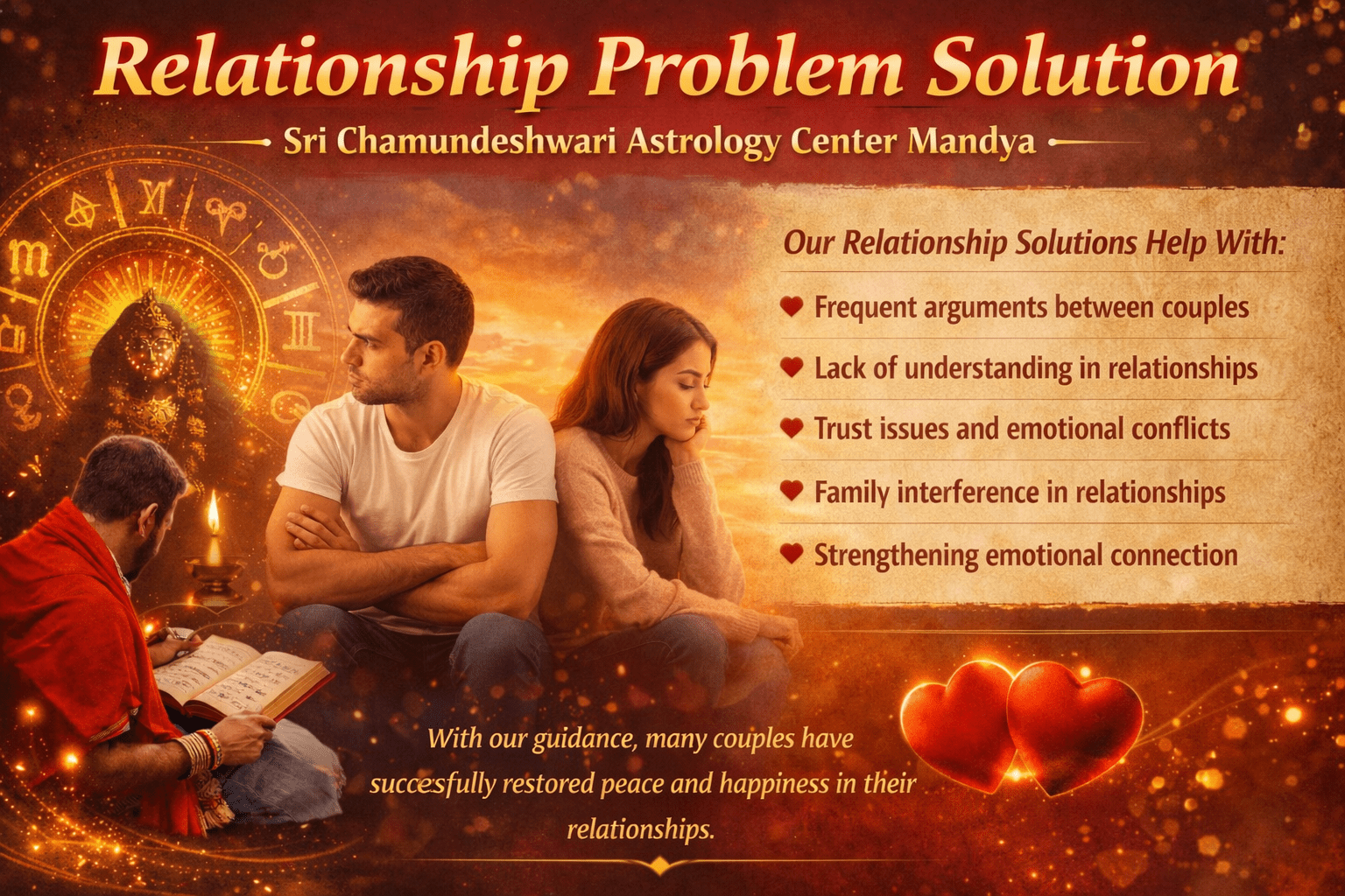 At Sri Chamundeshwari Astrology Center, we provide spiritual guidance and astrology-based remedies to help solve relationship issues and strengthen emotional bonds.